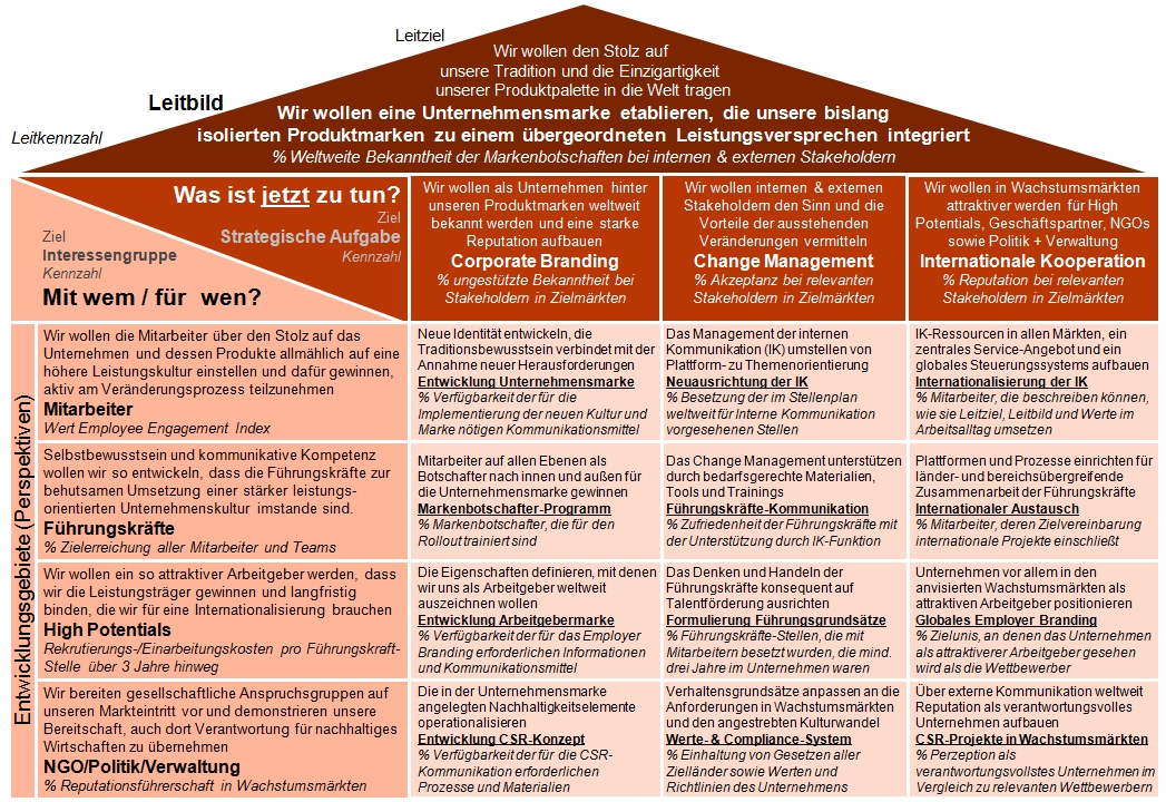 Eine handfestere Visualisierung emöglicht das 2000 von Friedag und Schmidt vorgestellte Strategische Haus der BSC. Dieses ganzheitliche Zielsystem bietet sowohl den strategischen Aufgaben als auch allen wichtigen Interessengruppen ein Dach und setzt beide Ebenen konkret in Beziehung zueinander.