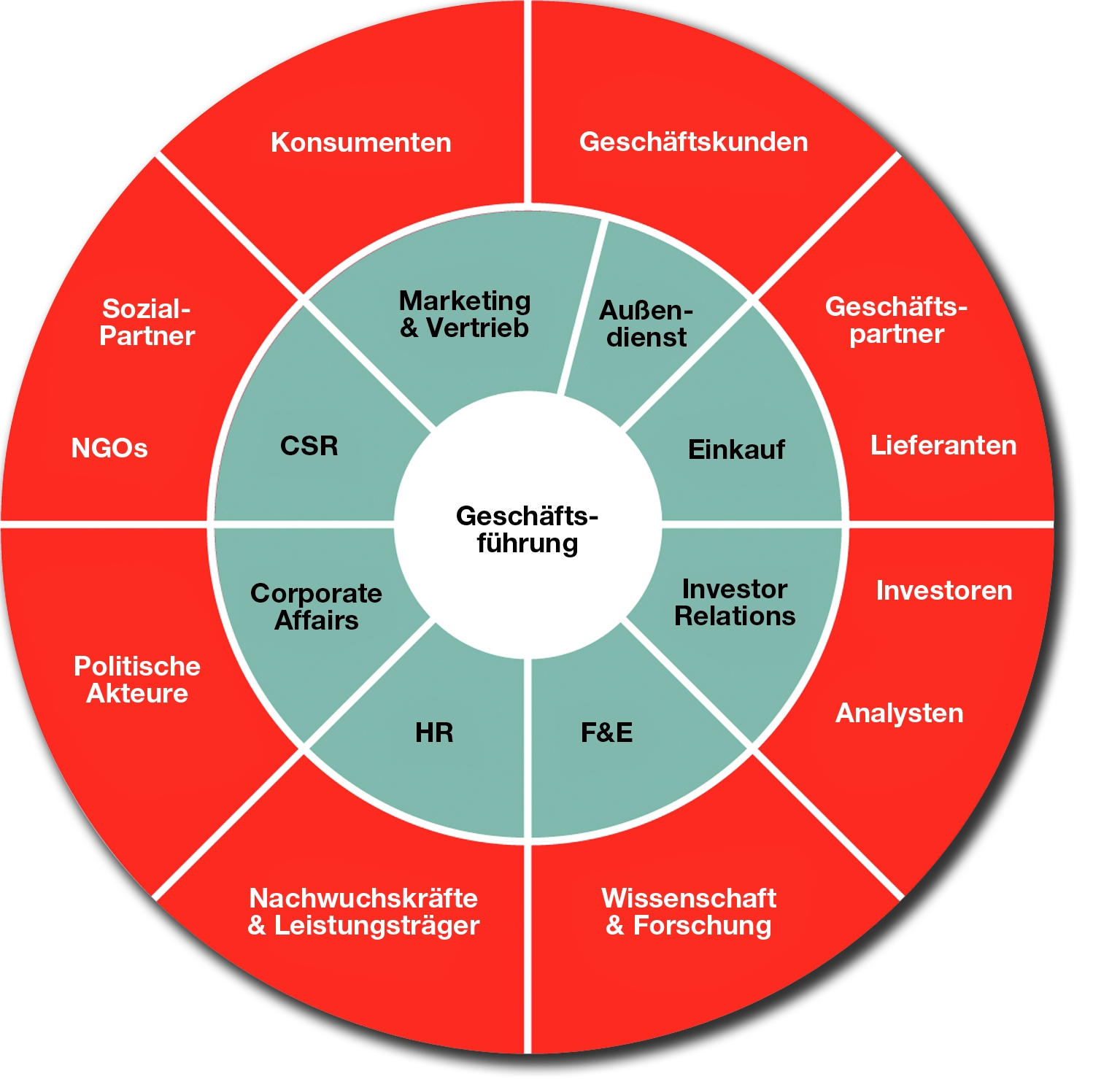 Erst im zieldienlichen Verhalten der Stakeholder zeigt sich der strategische Leistungsbeitrag der Kommunikation. Reputationsmanagement ist daher mehr als die Summe von Marketing, PR, IR und Lobbying. Dafür sind alle Mitarbeiter verantwortlich: jeder als „Macher“, die Führungskräfte als „Kümmerer“ und letztlich der Vorstand, der Leitziel und Strategie bestimmt.